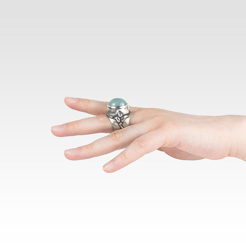 A powerful milk aquamarine stone sits on top of this one-of-a-kind fine and sterling silver show-stopper. Limited quantities are available, ensuring each item's exclusivity.